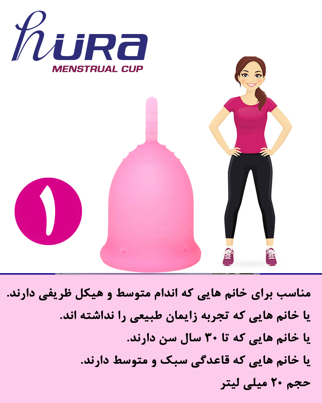 کاپ قاعدگی حورا، سایز یک(کوچک), مناسب براى خانم هايى كه اندام متوسط و هيكل ظريفى دارند يا خانم هايى كه تجربه زايمان طبيعى را نداشته اند يا خانم هايى كه تا 30 سال سن دارند. يا خانم هايى كه قاعدگى سبک و متوسط دارند.